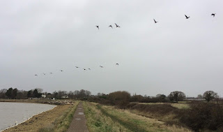 Further down it was clear where they were coming from, a large group were at Prinstead. They seemed to have been agitated by the tide and, in groups were flying off to join the ones by the Bunny. Why they prefer one spot to another wasn’t clear, they were both exposed, maybe they felt safer there. It’s always uplifting to see such big birds flying directly overhead!