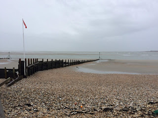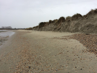This morning its grey and drizzly at East Head but the visibility is not too bad as the West Pole beacon is just about visible. Although the tide is at least an hour or more after low water the sandbanks of the Winner are clearly visible out towards the channel on the far side by Hayling Island.