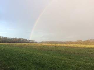 The rain had aggravated the flooding so the lane to the farm had deeper water than ever before and the fields looked distinctly sad. The upside was a magnificent rainbow that appeared to the southwest; although the picture only shows part of it it was a full arch and much brighter earlier, while I was trying to make my phone camera work.