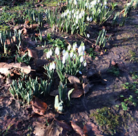 The sun seemed to have brought out the snowdrops in the churchyard, they’d only been shoots earlier and were now brilliant patches of white signalling progress towards spring. The daffodils were growing strongly too and not far away from flowering.