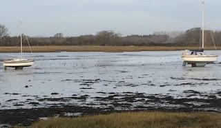 The channel was nearly empty as the tide was very low, all the moored yachts being high and dry. This seemed to have uncovered some fertile mud as there was a host of birds along the edge and in the water. In particular there were well over 100 waders, mainly Redshanks but there may have been a few others amongst them. Some Dunlin flew back and forth in formation.