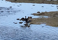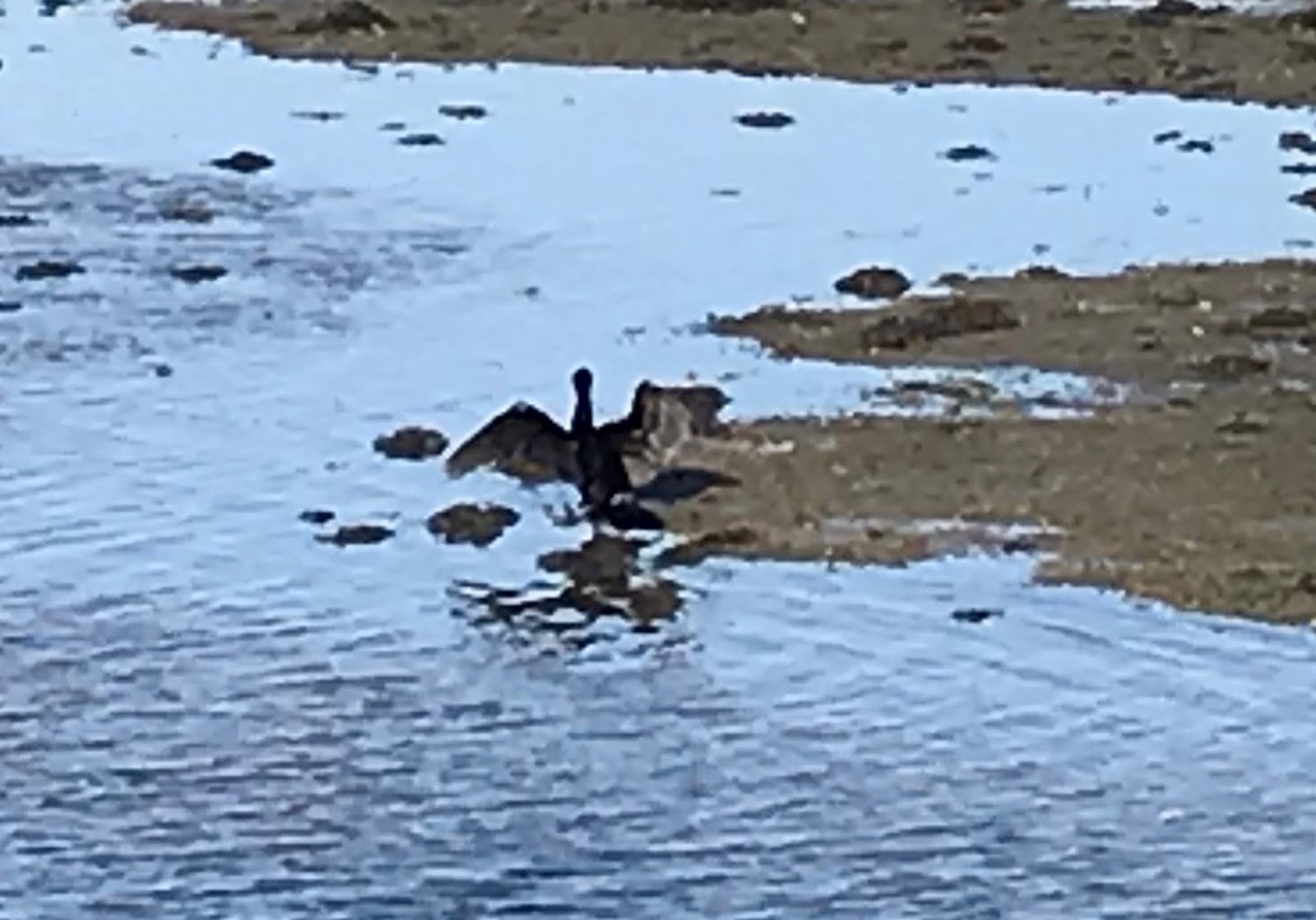 Out on the water this Cormorant was drying his wings in the breeze almost alone in the stream. The wigeon were all around the edges feasting on algae, that would make them smell!