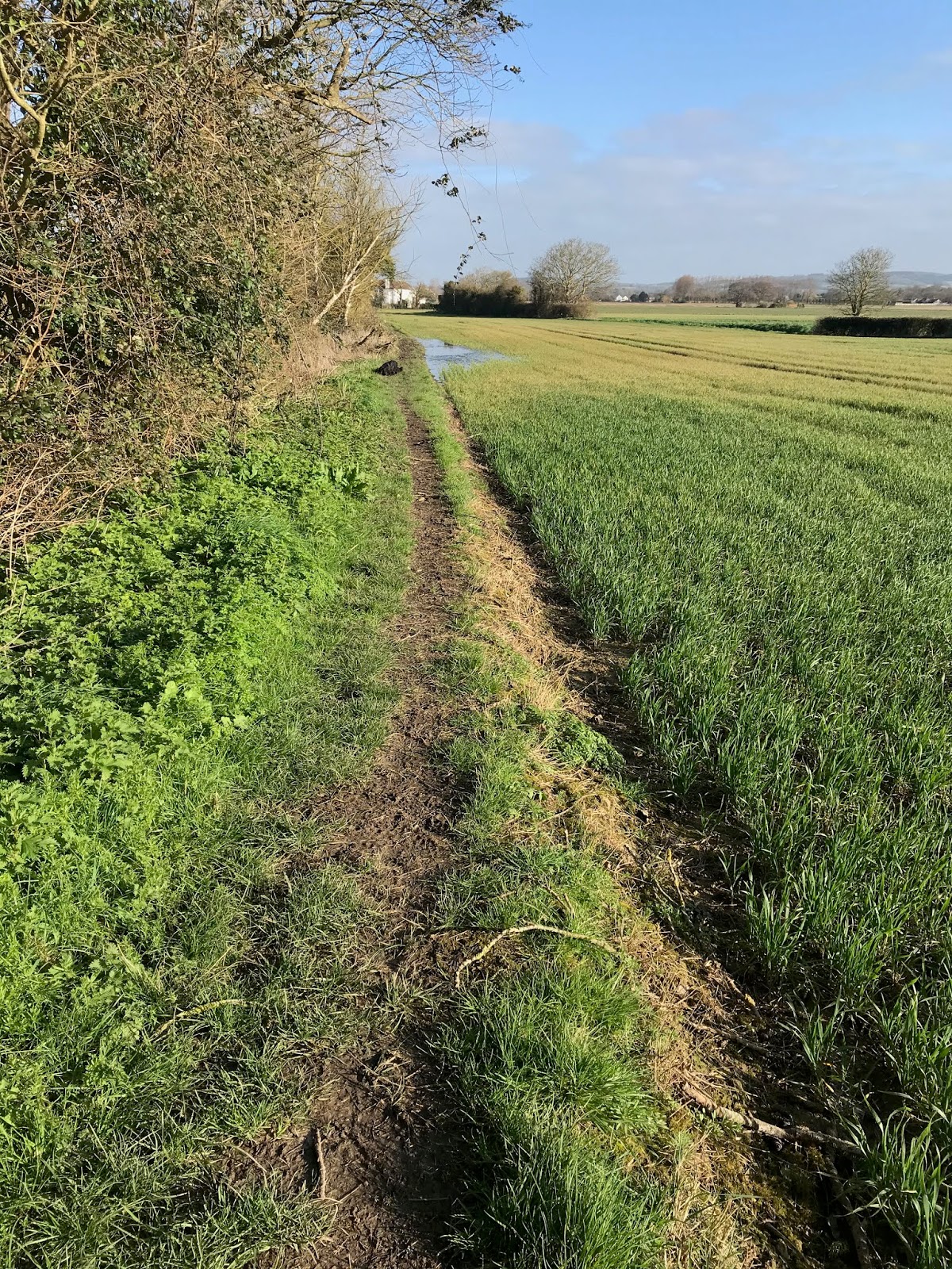 After a couple of relatively dry days with a stiff breeze the countryside is starting to dry out, at least a little bit anyway. The surface of the mud is a bit crusty where it’s dried out and the fields don’t look quite so water logged. Some crops like this winter wheat are growing strongly now but they’re in the minority. Many fields have stunted crops or nothing at all where the soil is too damaged for machinery to be able to get out. On the Manhood peninsular acres of lettuces have been abandoned so there’s no need for crop protection, they’ve gone!