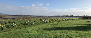There’s other colour about, especially these daffodils that make a splendid display on this sea wall. Elsewhere there are large patches of lesser celandine and plenty of dead nettle, both white and red. Unfortunately there’s not much activity out on the mud, very few waders or wildfowl in evidence; they must be down in the channel.