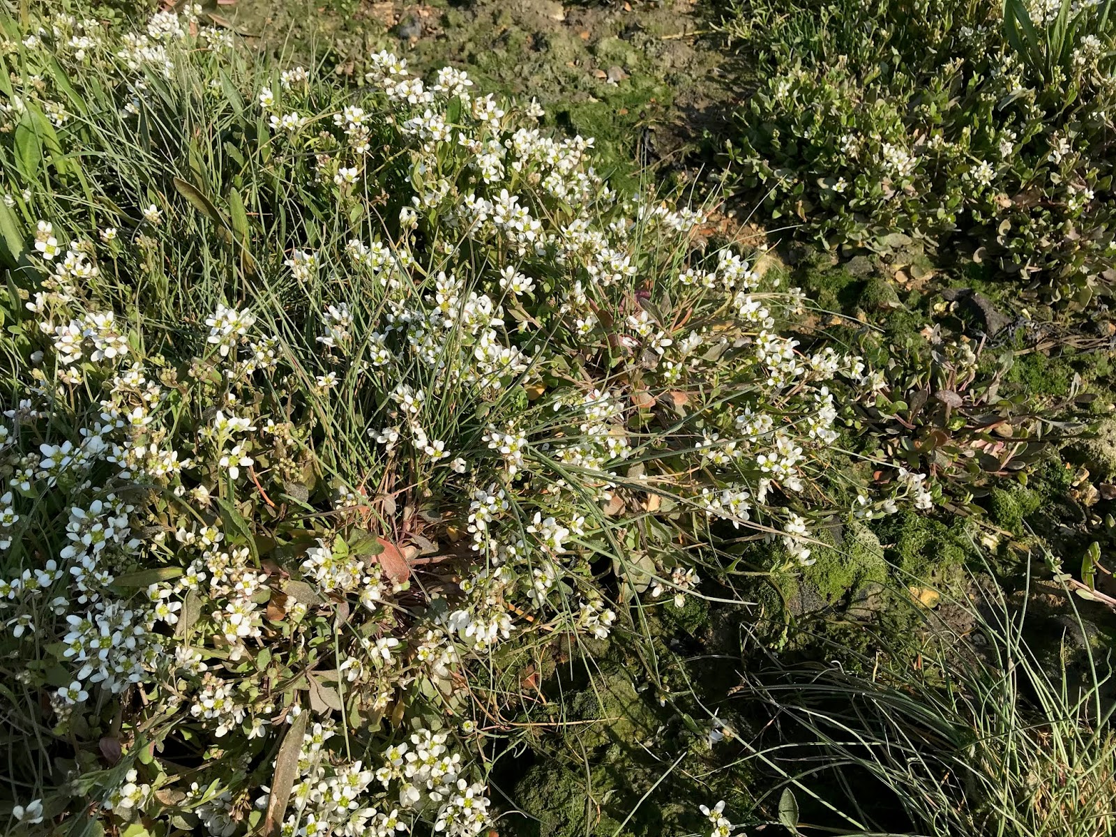 At the foot of the sea wall this small white flower has come out in dense clumps. It seems to be Common Scurvy Grass which is a very appropriate name for a plant that likes saltmarsh.
