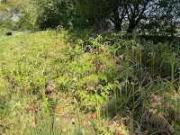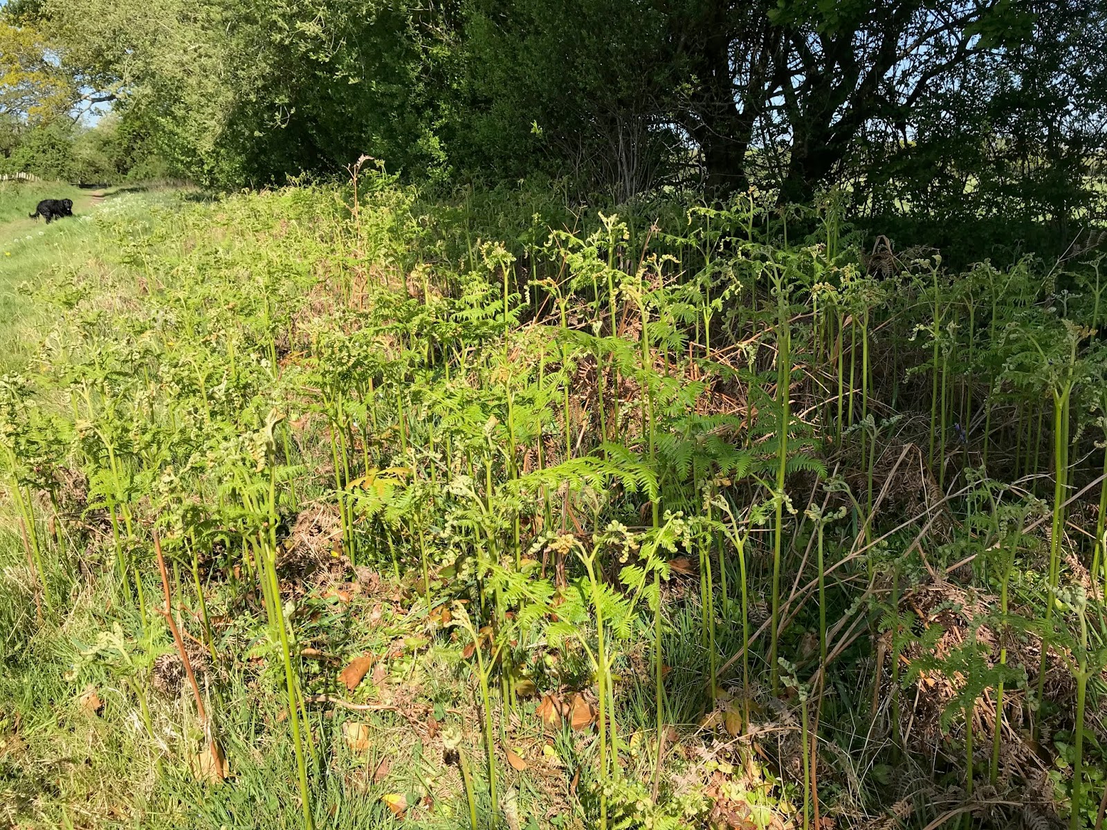 Once in the fields hardly anyone follows us which is much better so we can appreciate the lush green hedgerows and trees that abound. Over the past few days the Bracken really has sprung up; once it gets going the young shoots seem to change on a daily basis. From small shoots they’ve now risen to become strong plants almost waist
