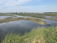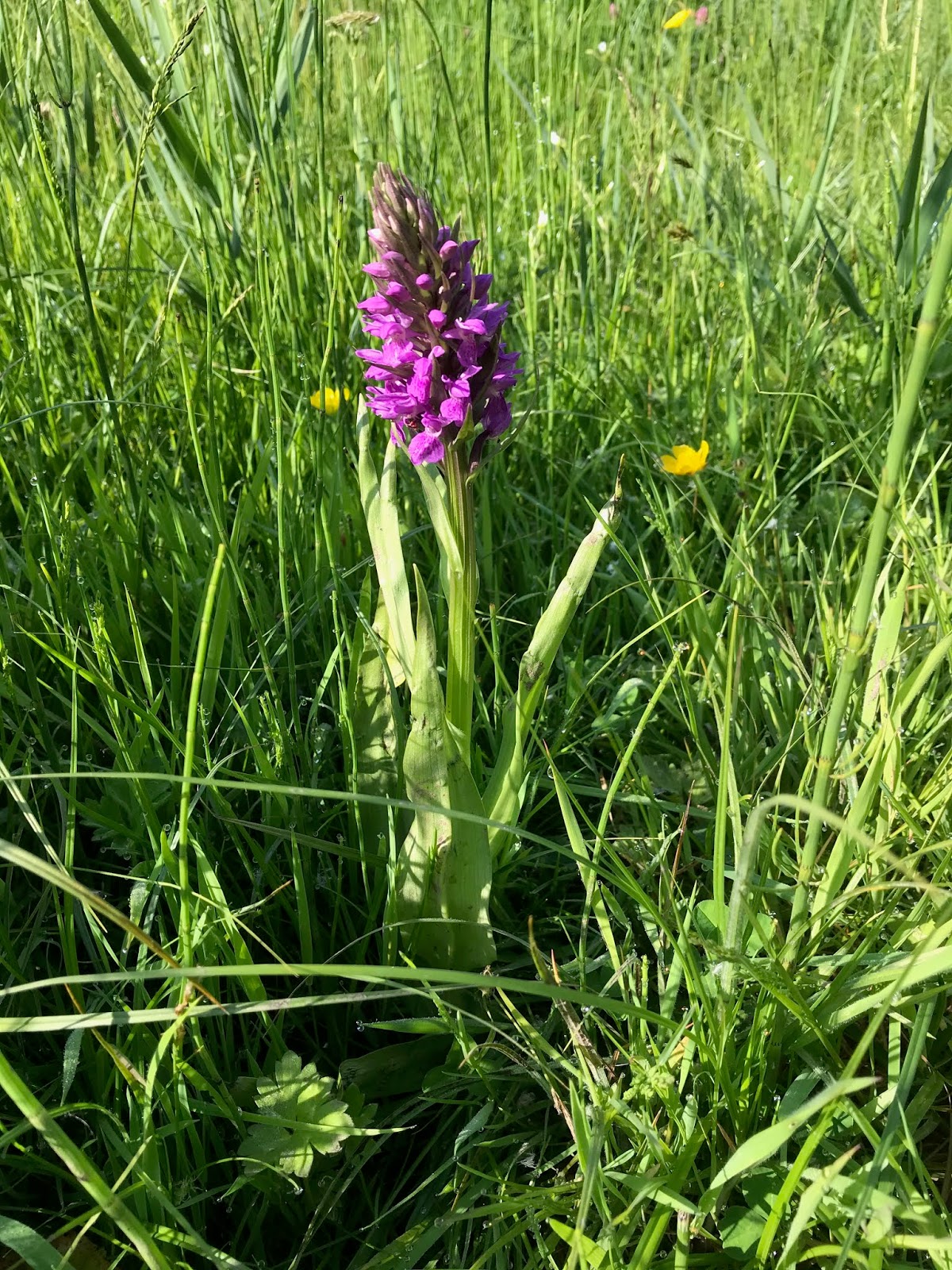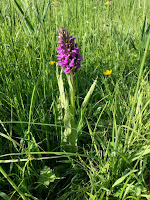 Although the tide was at it’s lowest at 5am, by 9am it still hadn’t come in much so plenty of the stony bottom of the Lavant outfall was visible. Just in front of the sea wall I was surprised to see several small birds playing around in the water amongst the stones. I didn’t have any binoculars so could not be sure but they did appear to be Ringed Plovers which is a bit unusual at this time of year. Were they some that didn’t migrate to Africa to breed but stayed here instead or were they Arctic ones? Either way they made a pleasant diversion from the Mallard, Shelduck, Little Egrets and of course, Swans that were present in some numbers.In the meadows the grass was punctuated by these Orchids, the first we’d seen this year. I think they were Early Purple Orchids which like these conditions but it’s possible they could have been Early Marsh Orchids which was what my app suggested. They were quite numerous on this regularly grazed meadow, it just shows the value of livestock.