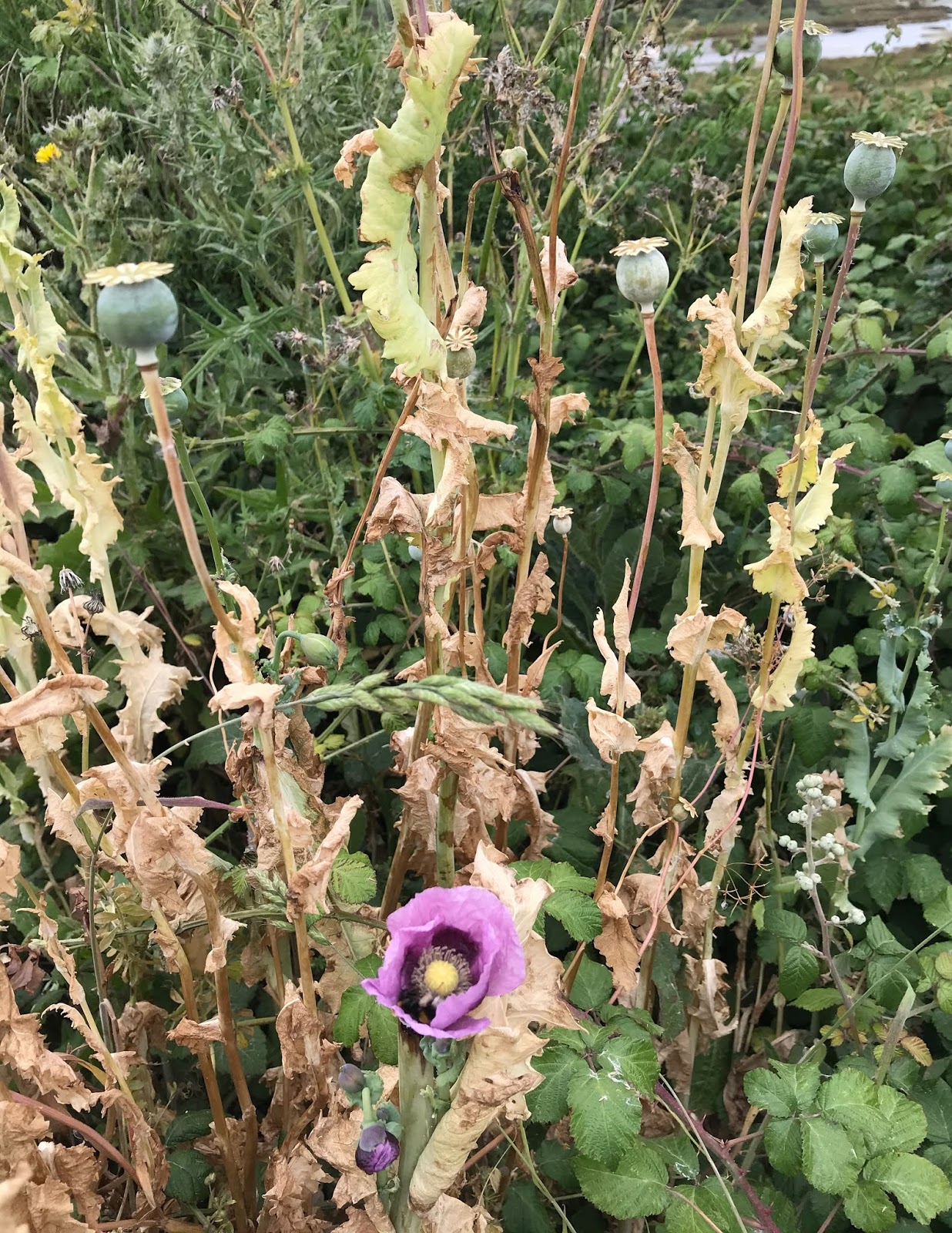 The path was very dry, so was the growth beside it. We’d missed seeing most of the patches of Poppy in flower as they’d turned to seed with one exception, this lovely flower. If I’m not mistaken this is an opium poppy, so different from the bright red or yellow varieties. I wonder how it got there?