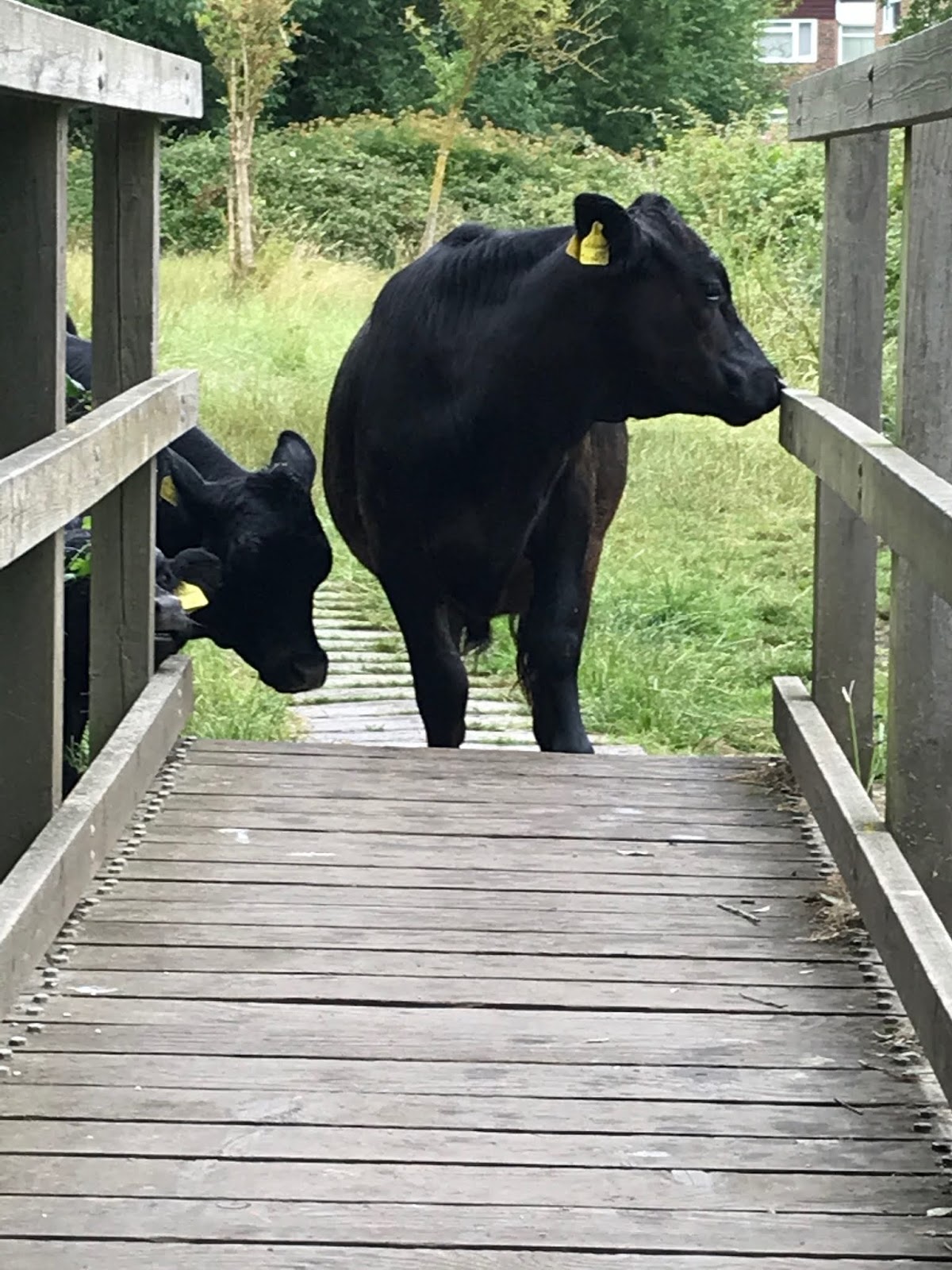 The cattle are out grazing in Fishbourne Meadows, about a dozen black cows and heifers. They’ve either munched or trampled down many the over grown places so doing a good job of maintaining this as a traditional meadow. They’re clearly chosen to be tolerant of people that frequent the footpaths, in fact amazingly curious. This one wanted to follow us over the bridge without any concern about Bonnie or I.