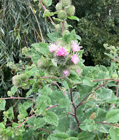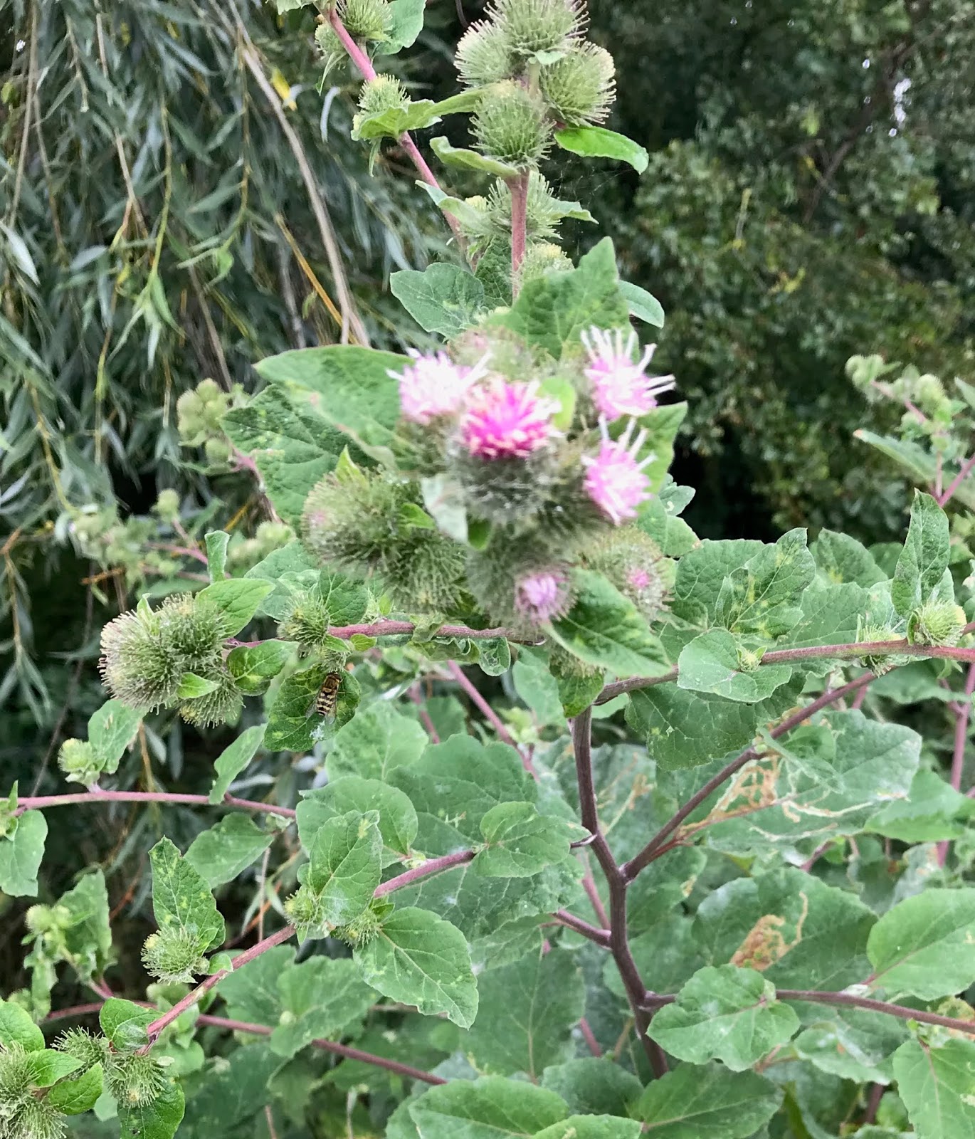 It’s a grey day but there are still a few flowers to brighten up the landscape. New ones appearing today are the Great Willowherb that’s just starting to flower; its similar to the Rosebay willow herb but likes damp places in contrast to the waste ground for the Rosebay variety. Burdock is starting to appear, apparently it’s the roots that are most useful to eat and for medicinal purposes and, I suppose the drink made with Dandelions.
