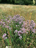 This part of the Downs is particularly good for wild flowers which flourish in the rides through the woods as well as the field margins. There’s one particular field that’s full of colour and interest even though it’s not grazed. Today there’s some Marjoram growing along the edge in large clumps, maybe little flowers but pleasantly aromatic. On some of the paths the statuesque Great Mullen is growing, bold lances of yellow stabbing upwards.