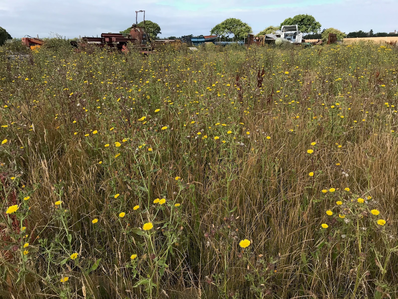 Near the reed beds a Heron flew off, probably it had been fishing in the pond there. Apart from that there was little else that was noteworthy, the crops had been harvested, plenty of Ragwort, a few sprigs of willow herb about. This Hawkweed Ox Tongue had taken over a fenced in patch of waste ground where they keep even more old vehicles.