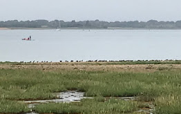 Nore there were a line of birds on the edge of the harbour but it was difficult to make out what they were as I’d forgotten my glasses. They seemed to look like Oyster catchers but there were too many about so probably Redshanks. Certainly there was an Oyster Catcher about as we heard a particularly vocal one. Opposite the ponds, right in the channel which was starting to empty on the way back we saw these small waders and a collection of ducks. The waders might have been ringed plovers, we’d seen some yesterday at Selsey, they were about that size. Not sure about the ducks, probably mallard that have come out again with new feathers.