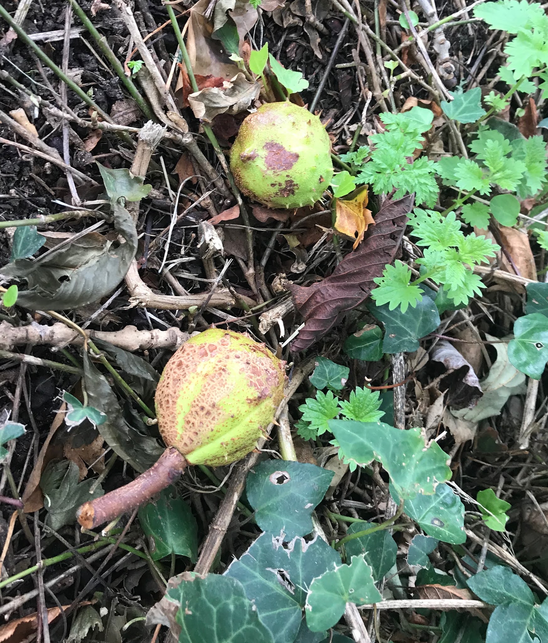 laden (or at least have some) with conkers. Almost ready to open, some of them have fallen in the wind but no fruits out yet.