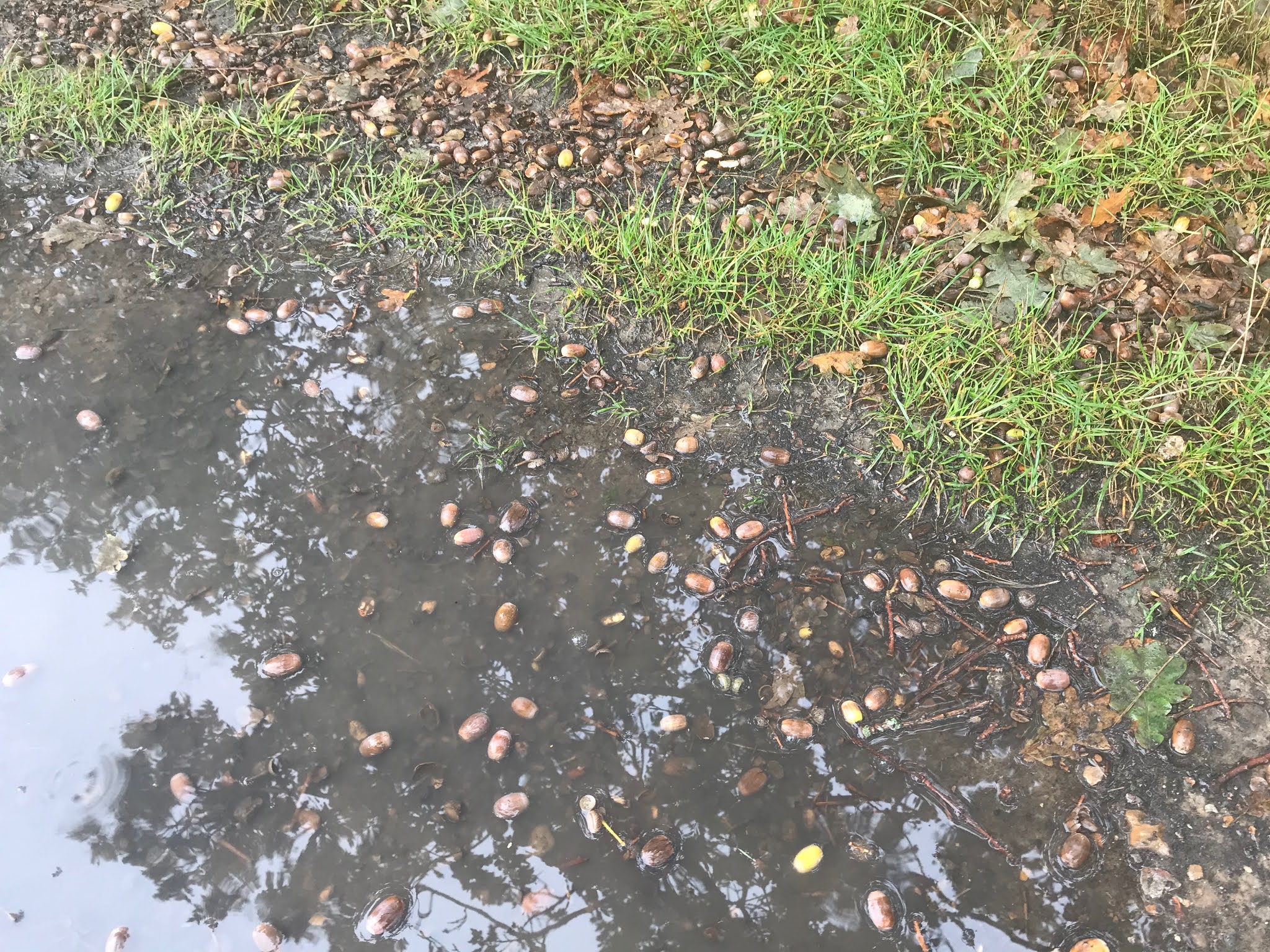 nuts, a good time for the Squirells! The dark ones were due to fall, the many light ones look like they’ve been prematurely shaken down. What’s needed are some pigs to root about so we could have some pannage pork.