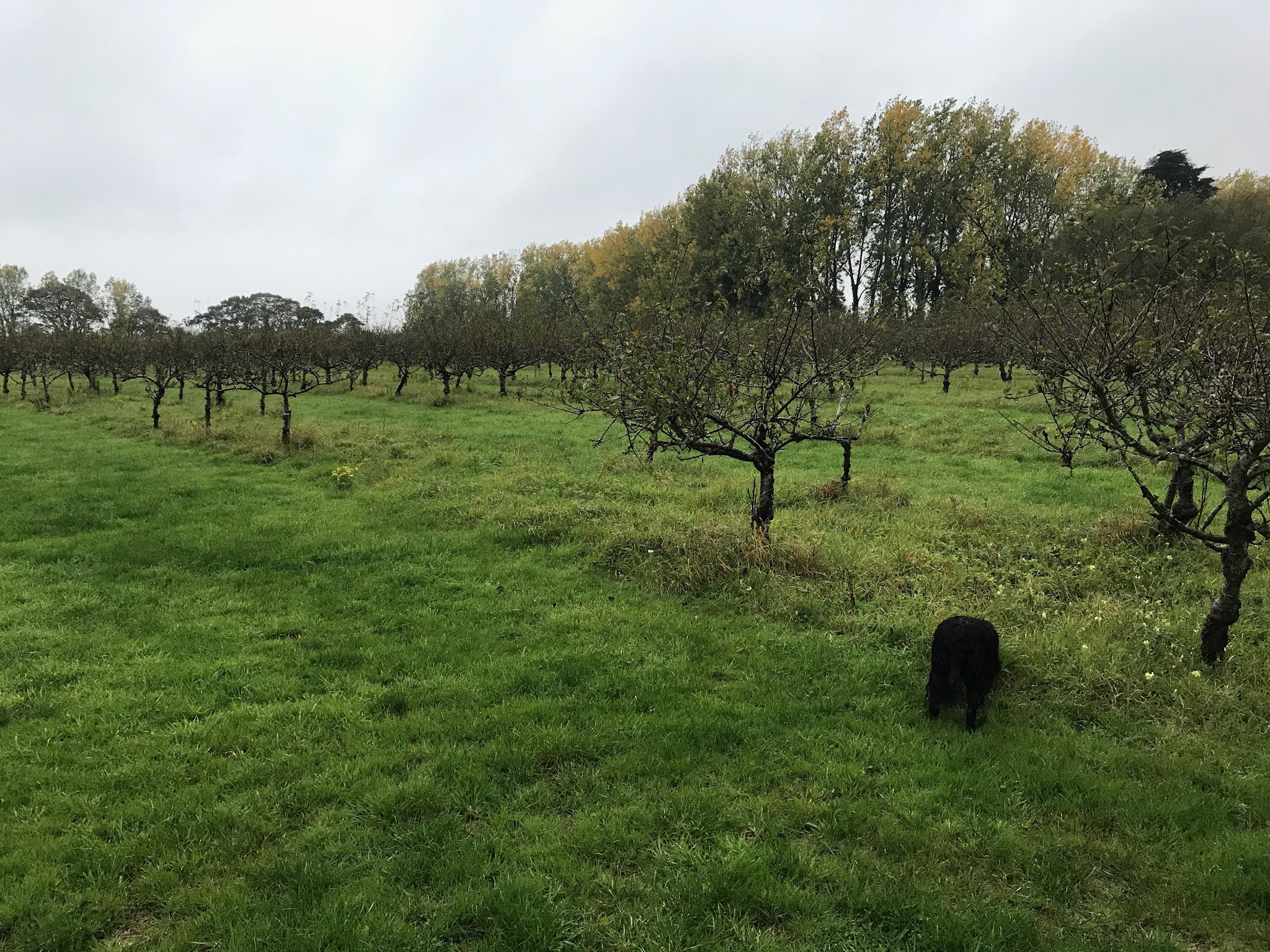 On the return there’s an old orchard that has hardly any apples visible this year although Bonnie did find one on the ground. Last year there was a bumper crop of bright red apples, such a contrast.