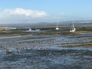 along the lane. The bright sunlight has banished the grey times we’ve recently experienced lighting up the sea, sand and countryside in bold colours. The tide was still out but even the mud seemed to glisten and come alive.