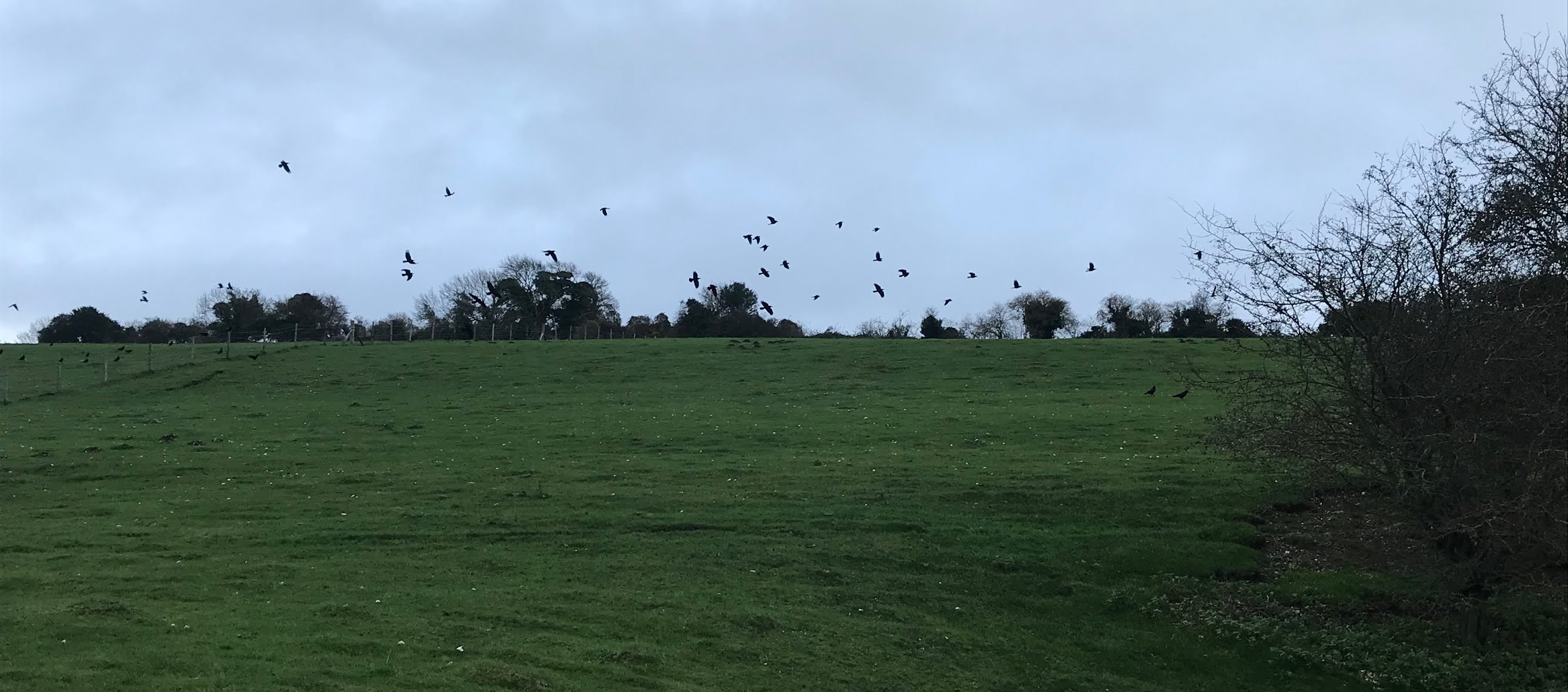 Out of the woods, on the downs where they slope sharply upwards, crows are in abundance. They’re sitting down covering the grassy hill one moment, up in the air, all flying in an agitated manner the next. The collective noun for them is a murder of crows, very apt as this gathering seems far from friendly.