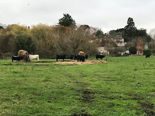 On the path along the Lavant Valley it’s muddy but the songbirds are singing, or at least making alarm calls. These cattle seem happy enough but why they’ve been given this supplementary feeding I’m not sure, the grass looks lush enough and there’s plenty of it. Despite the amount of rain the groundwater. clearly hasn’t risen yet as the Lavant is dry with grass covering the stream bed.