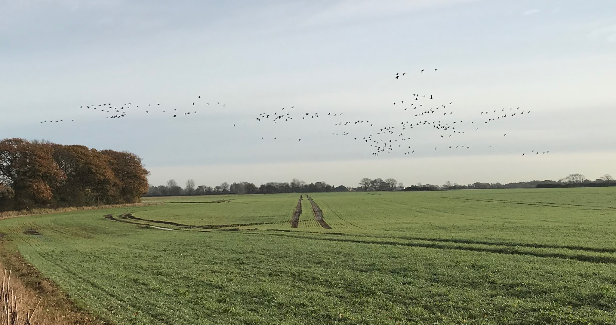in the channel for the duck and geese which line the edges. Every now and then a group of Brent Geese take off, briefly get into formation, then drop down onto the adjacent field. The young grass must be attractive, as large numbers are suddenly arriving. It’s 9 o’clock so must be breakfast time for these geese; in the space of a few minutes the harbour empties as they all follow their leader flying from roost to feed. The same is happening at the head of the harbour, skein after skein is flying south along the channel, wheeling round to face the light breeze, flare then drop into any space left that’s close to the others. As we leave there’s an increasing cacophony of noise from the dark grey mass that’s covering the field.